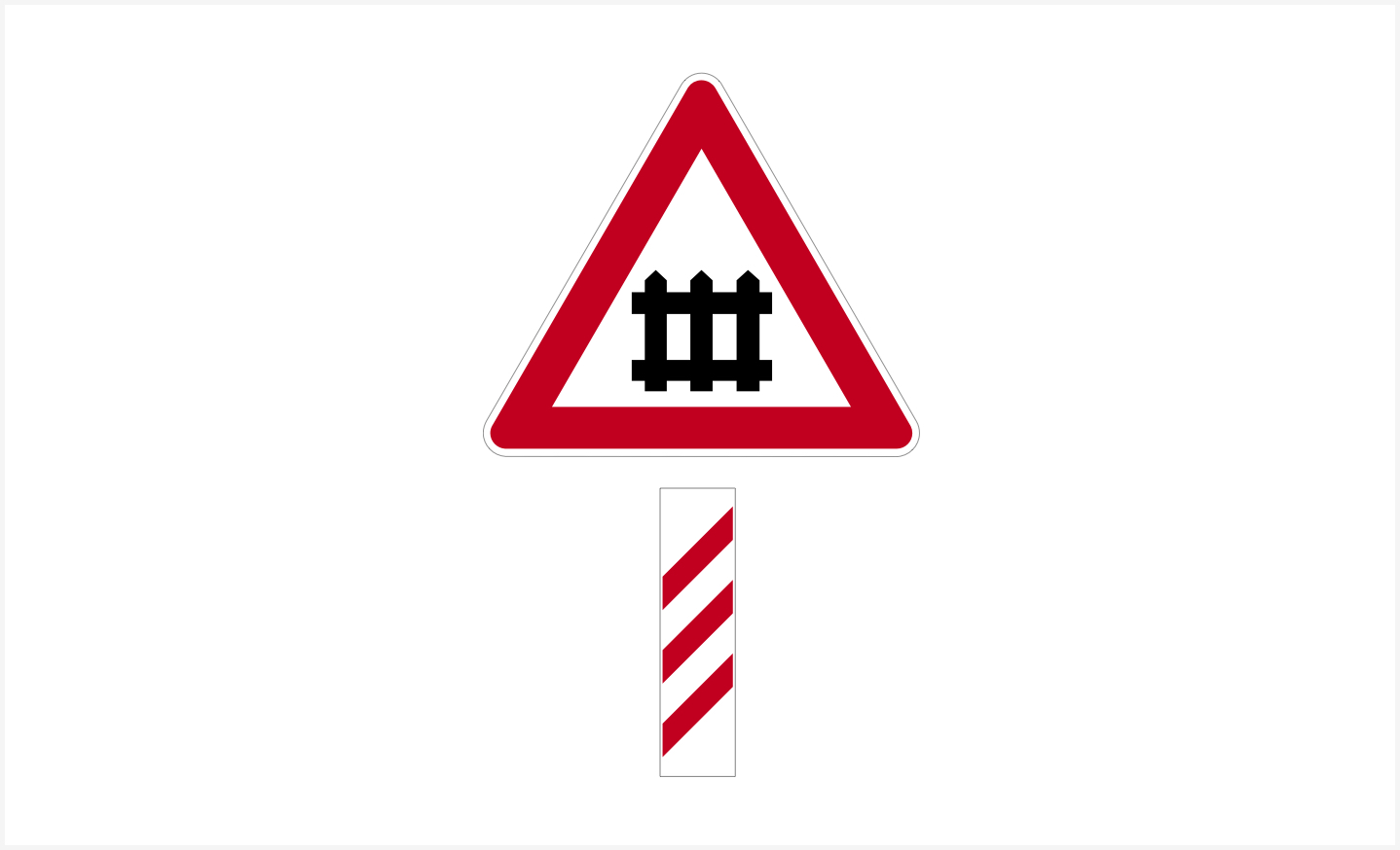 Sinjali i shoqëruar me panelin distancometrik, si në figurë, tregon se në largësinë 150 metër ndodhet një kalim në nivel i ruajtur me barriera.