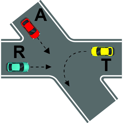 Në kryqëzimin e paraqitur në figurë, radha e kalimit të mjeteve është: R, T, A.