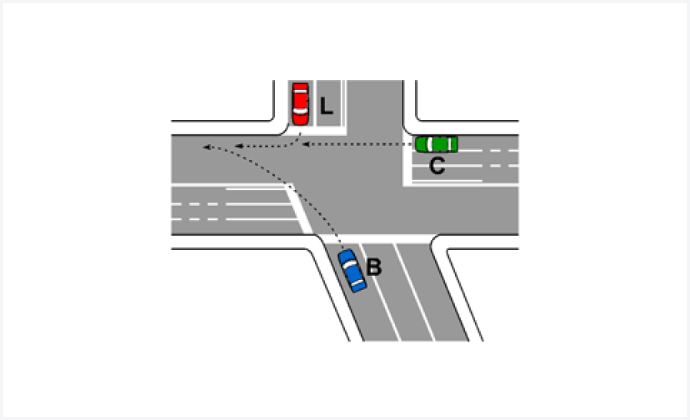 Në kryqëzimin e paraqitur në figurë, mjeti C kalon i pari sepse i duhet të lëvizë drejt.