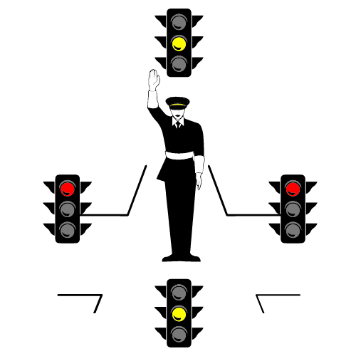Pozicioni i punonjësit të policisë rrugore si në figurë na detyron të ndalojmë edhe kur e kemi kaluar vijën e ndalimit.