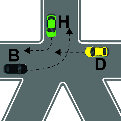 Në kryqëzimin e paraqitur në figurë, mjetet H dhe B mund të kalojnë njëkohësisht.