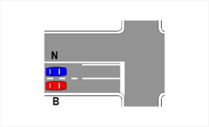 Sipas sinjalistikës në figurë, mjeti B, nëse kthehet djathtas, duhet të ndezë sinjalin e djathtë, pas kthimit.