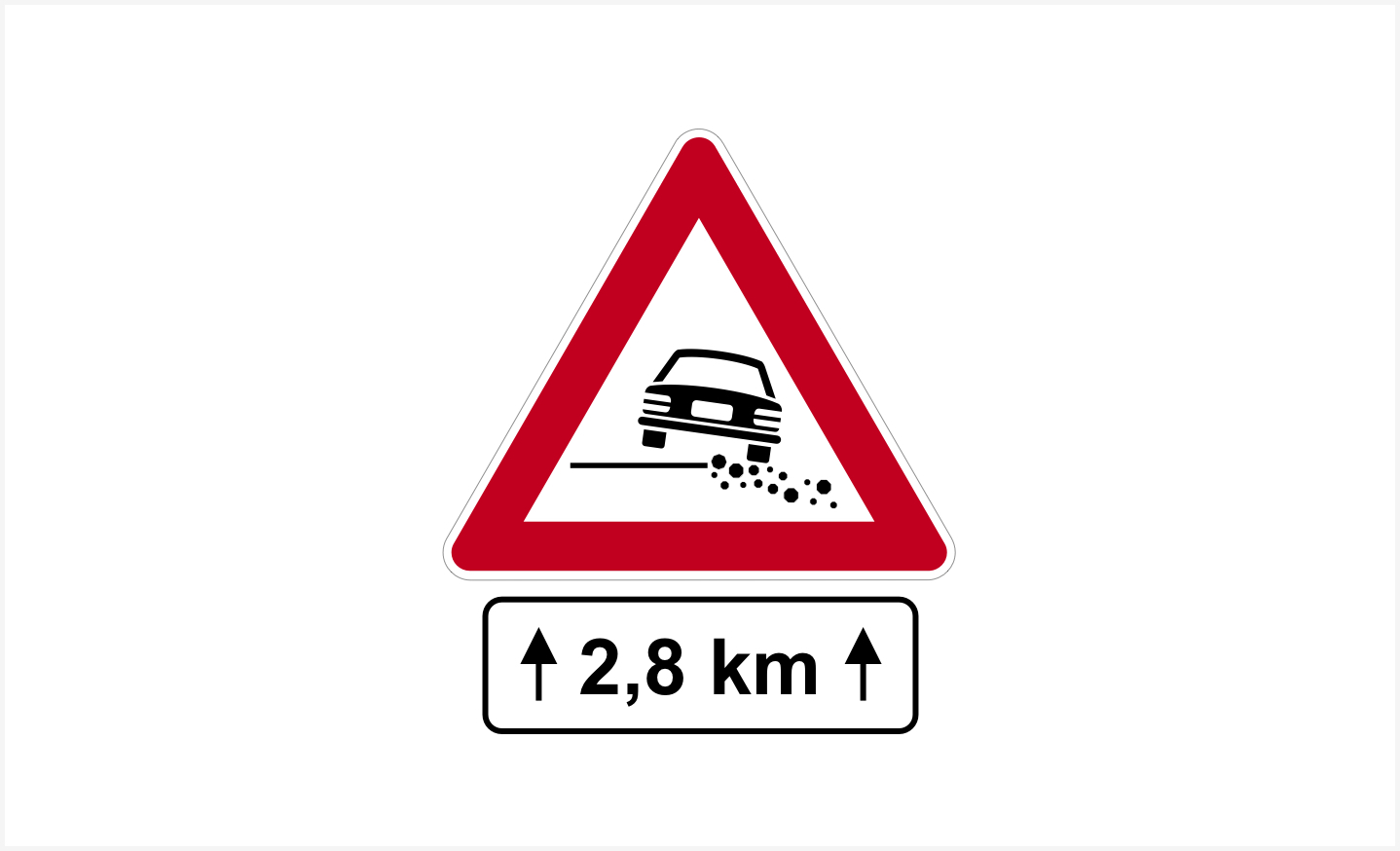 Sinjali, i shoqëruar me panelin plotësues, tregon se gjatësia e bankinës së dëmtuar është 2.8 km.