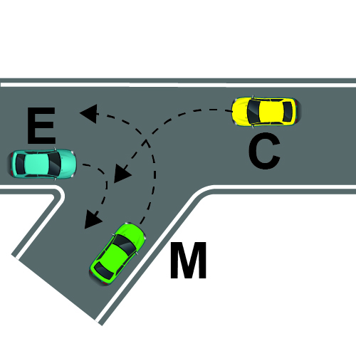 Në kryqëzimin e paraqitur në figurë, radha e kalimit të mjeteve është: E, M, C.