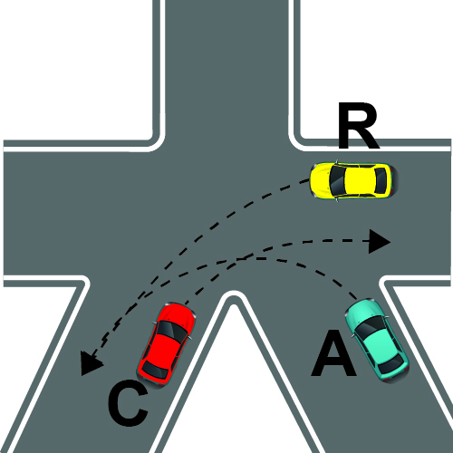 Në kryqëzimin e paraqitur në figurë, mjeti C kalon pas mjetit A.