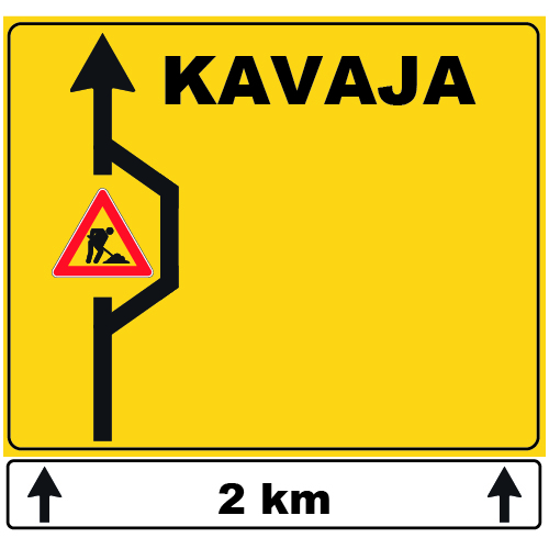 Sinjali në figurë sinjalizon se, pas 2 km, ka bllokim të rrugës për Kavajë.