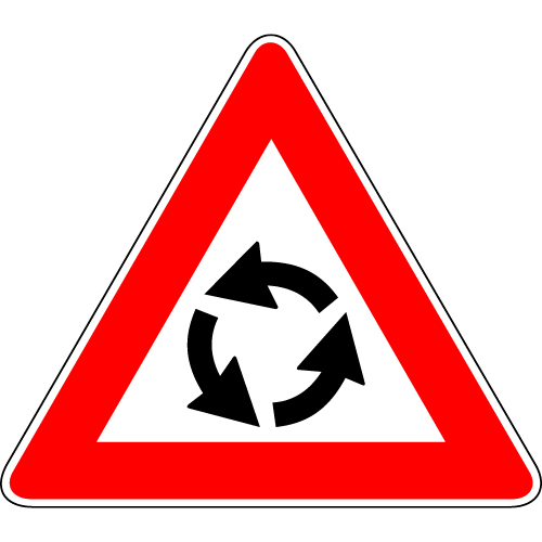 Sinjali në figurë, si rregull, në rrugë interurbane është i vendosur 150 metër përpara rrethrrotullimit.