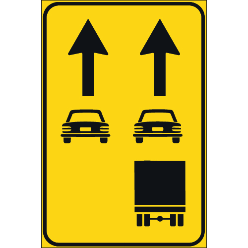 Sinjali në figurë këshillon qarkullimin e kamionëve me peshë të përgjithshme mbi 3.5 tonë, në korsinë e djathtë të karrexhatës.