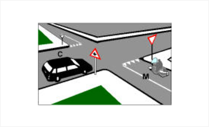 Në kryqëzimin e paraqitur në figurë, mjeti C vazhdon lëvizjen duke u siguruar që mjeti M ka ndaluar për ti dhënë përparësi.