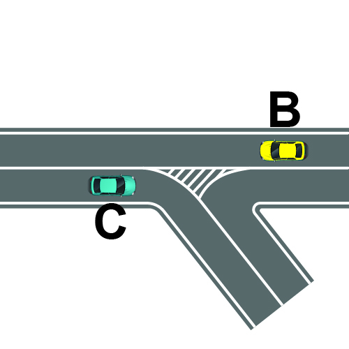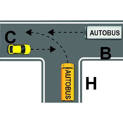 Sipas sinjalistikës në figurë, mjetit B i ndalohet kthimi majtas dhe është i detyruar të vazhdojë lëvizjen drejt.