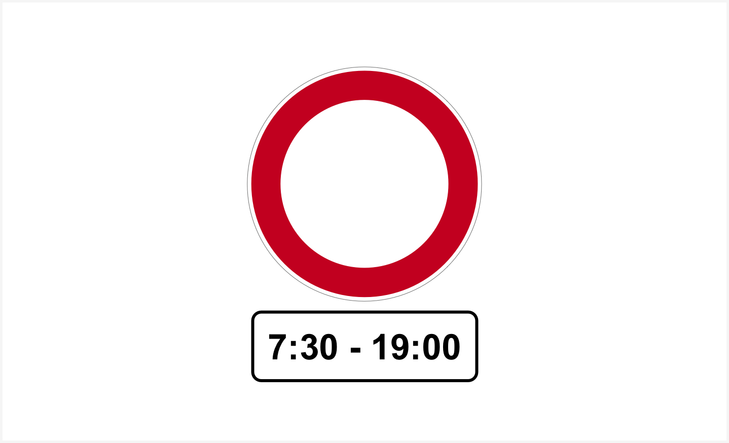 Sinjali i shoqëruar me panelin plotësues, si në figurë, tregon se ndalim qarkullimi i mjeteve është në fuqi nga ora 7:30 deri në orën 19:00.