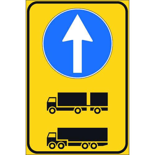 Sinjali në figurë detyron drejtuesit e autotrenave dhe të gjysmërimorkiatorëve të vazhdojnë lëvizjen drejt, për shkak të punimeve në rrugë.