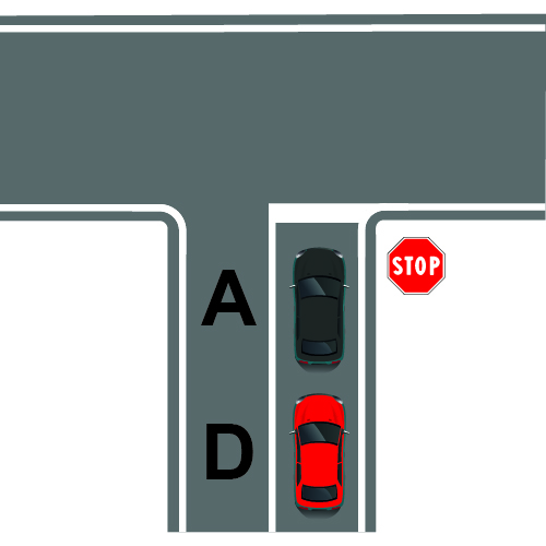 Sipas sinjalistikës në figurë, mjeti A është i detyruar të ndalojë në kryqëzim për të zbatuar urdhrin e sinjalit "STOP" (“Ndal dhe jep përparësi”).
